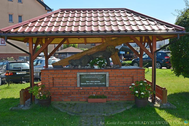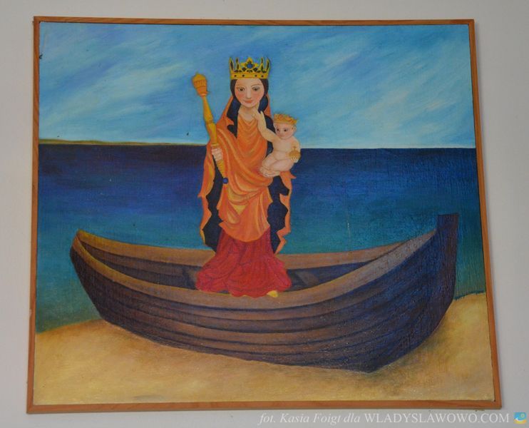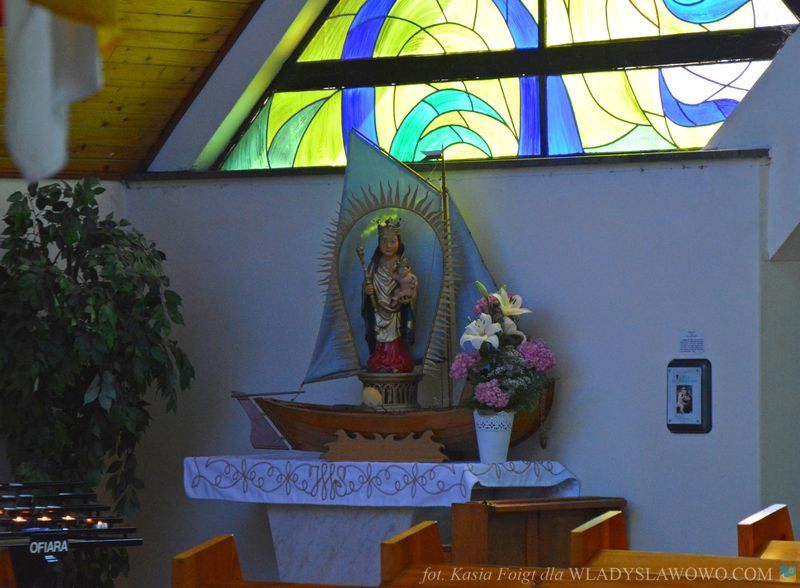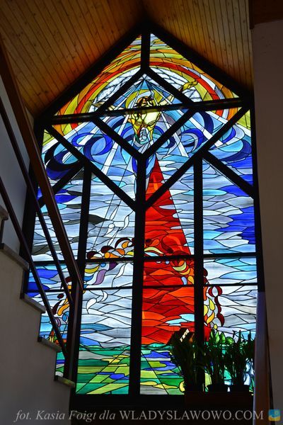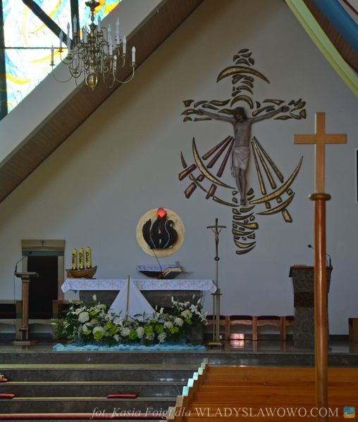 Bryła świątyni przypomina checz, tradycyjną niską chatę rybacką z wysokim dachem. Nad drzwiami wejściowymi umieszczono witraż, utrzymany w kolorystyce zielono-beżowej z napisem "Jestem, który jestem" oraz hebrajskimi literami JHWH. Na witrażu umieszczono kaszubski ornament kwiatowy. Autorem projektu kościoła oraz witraży jest ks. Roman Rychert.